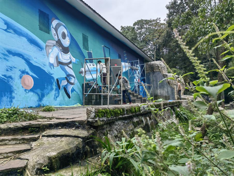二是公益彩繪打造美好社區(qū)。結(jié)合高質(zhì)量插畫素材,完成蒼坪路菜市口“幻夢星空”、健康路“熊貓墻”、南二路“大魚海棠”、碧峰峽熊貓基地“熊貓宇航員”、土橋社區(qū)“音樂熊貓”等公益彩繪5處。