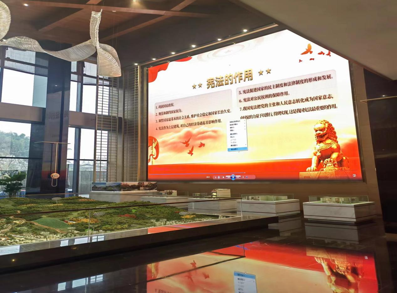 三是定點(diǎn)投放憲法宣傳標(biāo)語(yǔ)。為加強(qiáng)憲法宣傳,提高公民的法律意識(shí),同時(shí)起到時(shí)刻提醒公民關(guān)注憲法、了解憲法的作用,雅安文旅集團(tuán)通過酒店大屏、建設(shè)工地、房產(chǎn)銷售中心等多處電子宣傳屏投放憲法宣傳標(biāo)語(yǔ),以此營(yíng)造良好的憲法宣傳氛圍,增強(qiáng)了憲法學(xué)習(xí)宣傳聲勢(shì),形成了規(guī)模效應(yīng)。