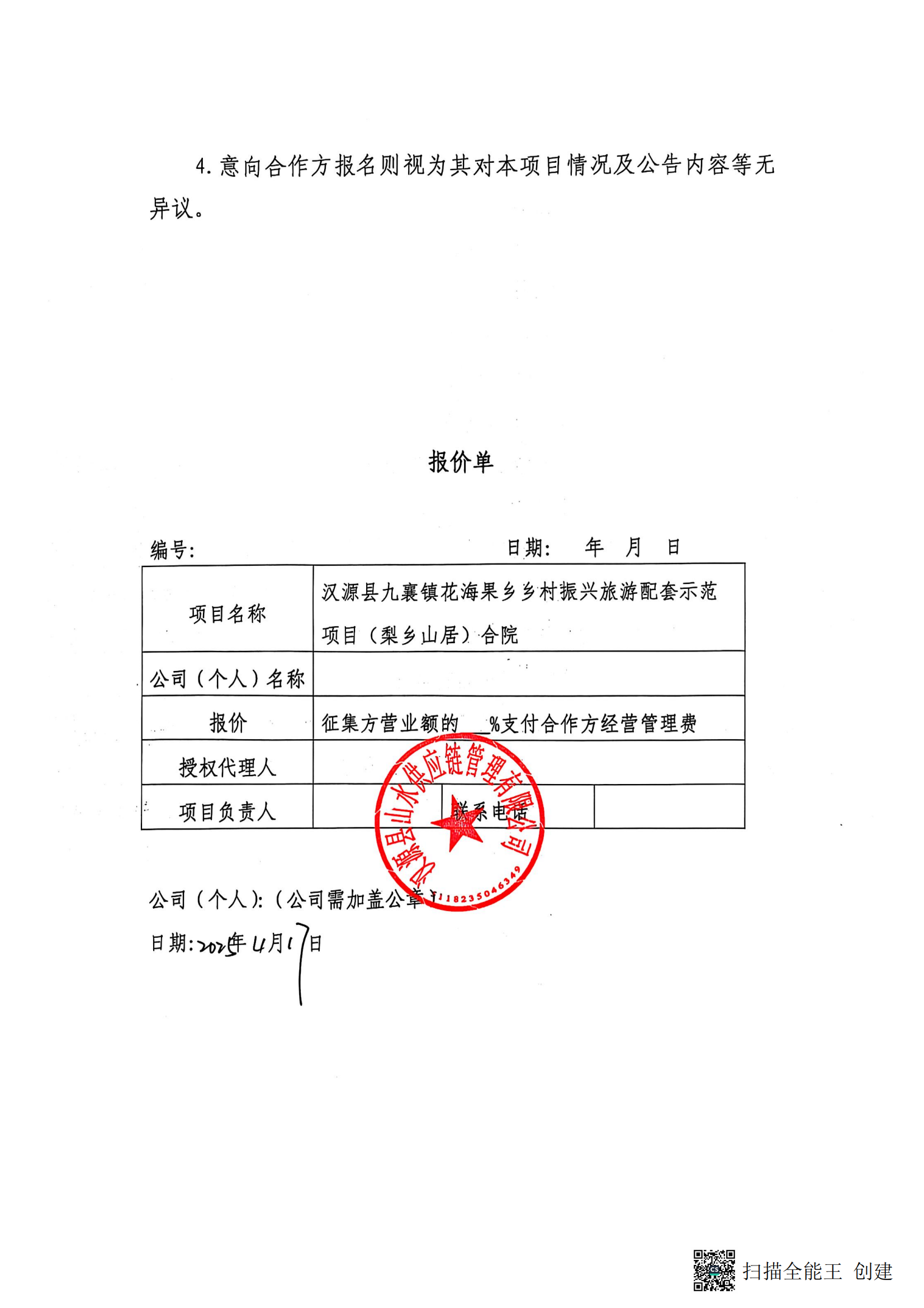 漢源縣山水供應(yīng)鏈管理有限公司關(guān)于公開征集漢源縣九襄鎮(zhèn)花海果鄉(xiāng)鄉(xiāng)村振興旅游配套示范項目(梨鄉(xiāng)山居)合院精品民宿運營管理(含前期裝修設(shè)計方案)合作單位 的公告